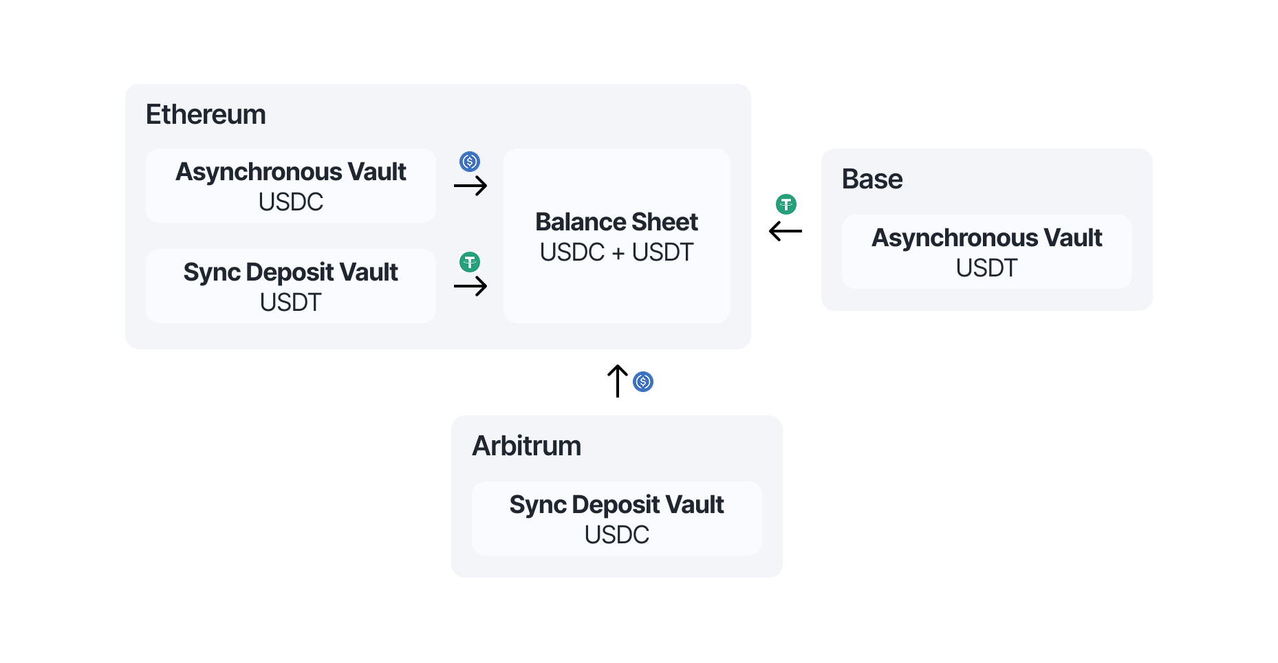 It is possible to support multiple investment assets per share token, using the ERC-7575 standard. Liquidity from all vaults is aggregated into a single balance sheet, to be allocated efficiently across all assets.