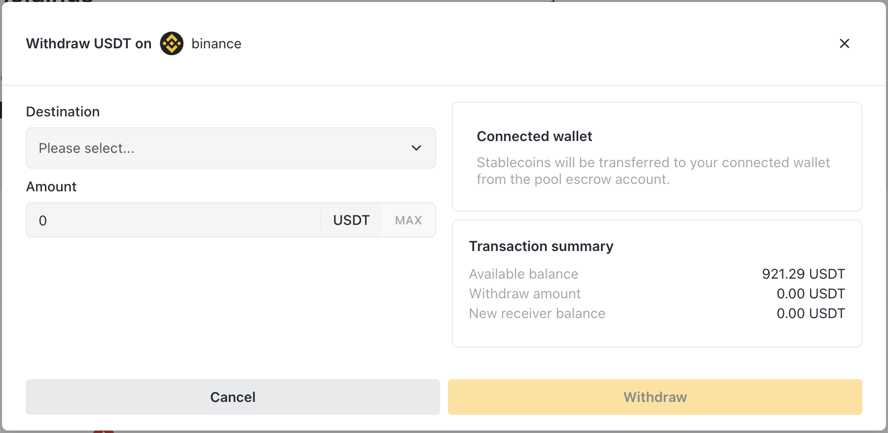 • Connected wallet - To your Balance Sheet Manager wallet